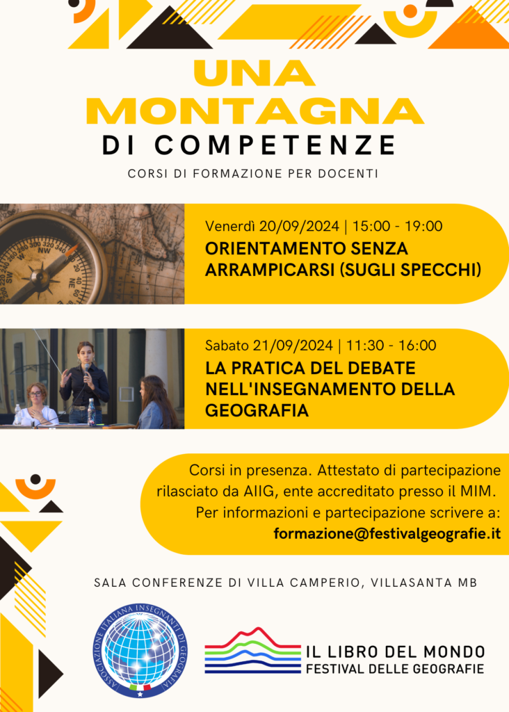 Anche quest’anno, grazie alla collaborazione dell’Associazione Italiana Insegnanti di Geografia (AIIG), ente di formazione accreditato dal Ministero dell’Istruzione, proponiamo durante il Festival due momenti laboratoriali per la formazione dei docenti delle scuole di ogni ordine e grado.